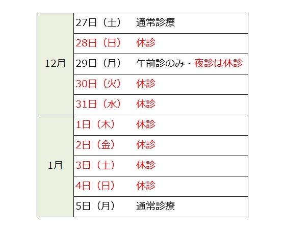 年末年始の外来診療は下記のとおりとさせていただきます。