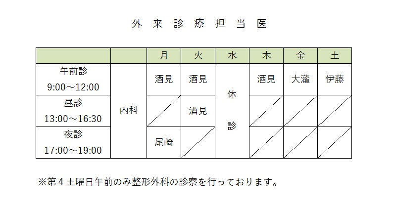 午前診: 9:00~12:00 (月・火・木・金・土) 午後診: 13:00~16:30(火曜のみ) 夜診: 17:00~19:00(月曜のみ)